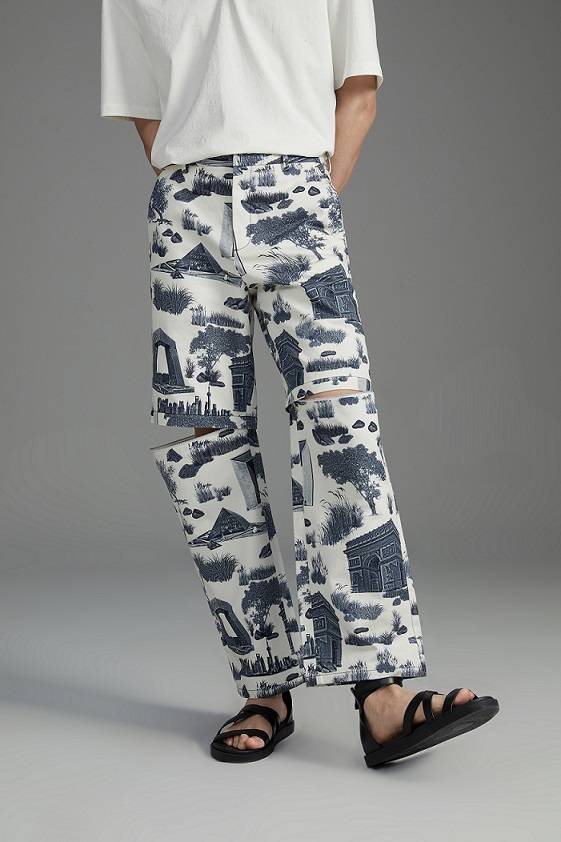 茹伊印花是十八世纪经典的法国图案,九牧王对其进行创新,以印花的方式将丝路上四个代表国家的经典建筑相互串联,展示从古?今的复兴之路。款式版型宽松舒适,结合斜纹布料的效果,具有很强的?体感和精致感。设计师将裤腿设计为可拆卸,让裤子可以达到?裤两穿的作?,既可作为?裤穿着也可秒变舒适短款,搭配不同的上装有更多的穿搭效果,玩转不同搭配风格。