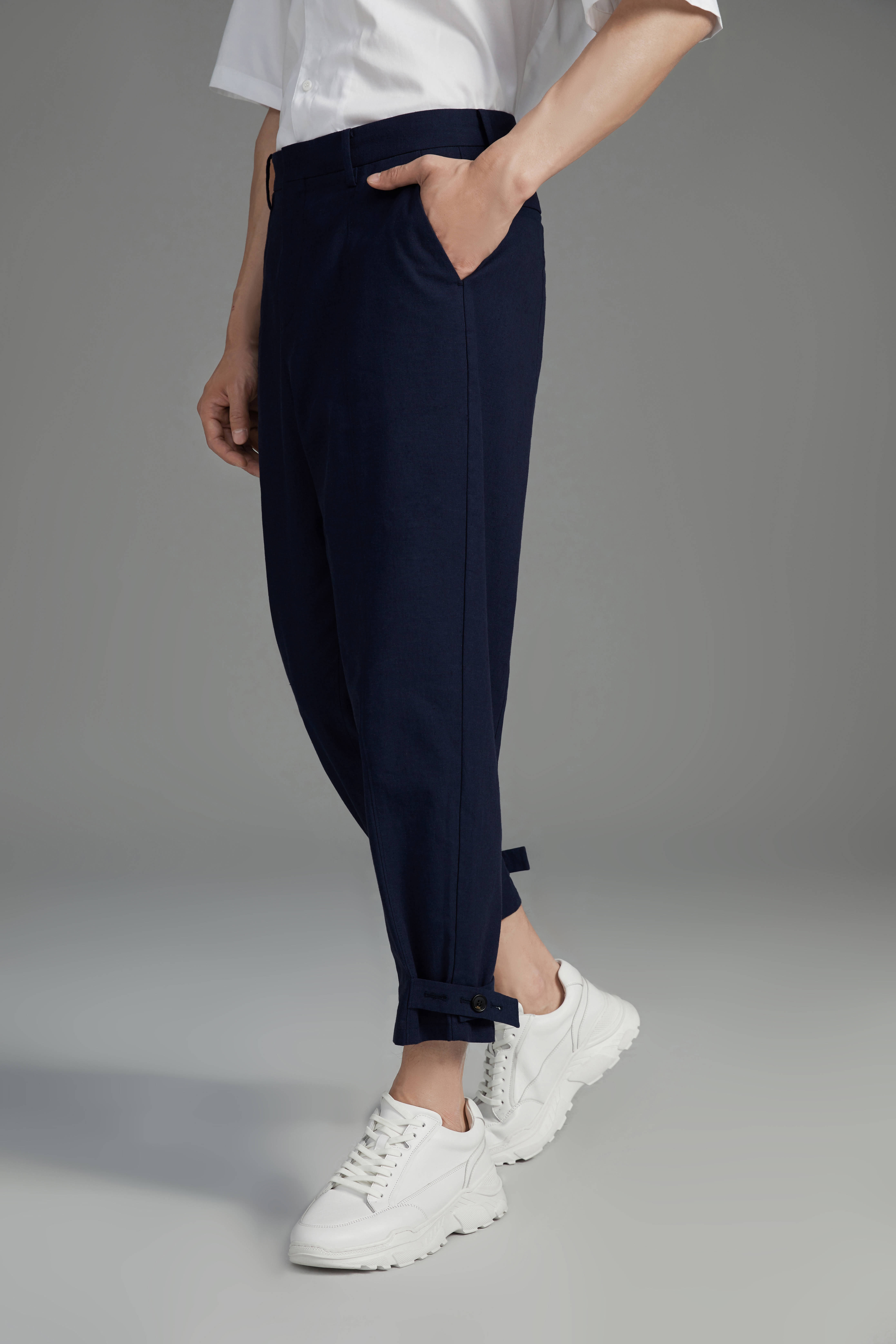 色彩方向,选取了海上丝绸之路沿途海底考古的中国瓷器碎片——中国青花瓷的蓝色来开场,似给人带来一缕清凉舒爽的夏季清风。优雅的青花瓷蓝结合锥形裤的设计,让穿着更加舒适有型;裤子脚口做了裤袢调节设计,结合精致贴片,体现了裤子的精致度和细节感。