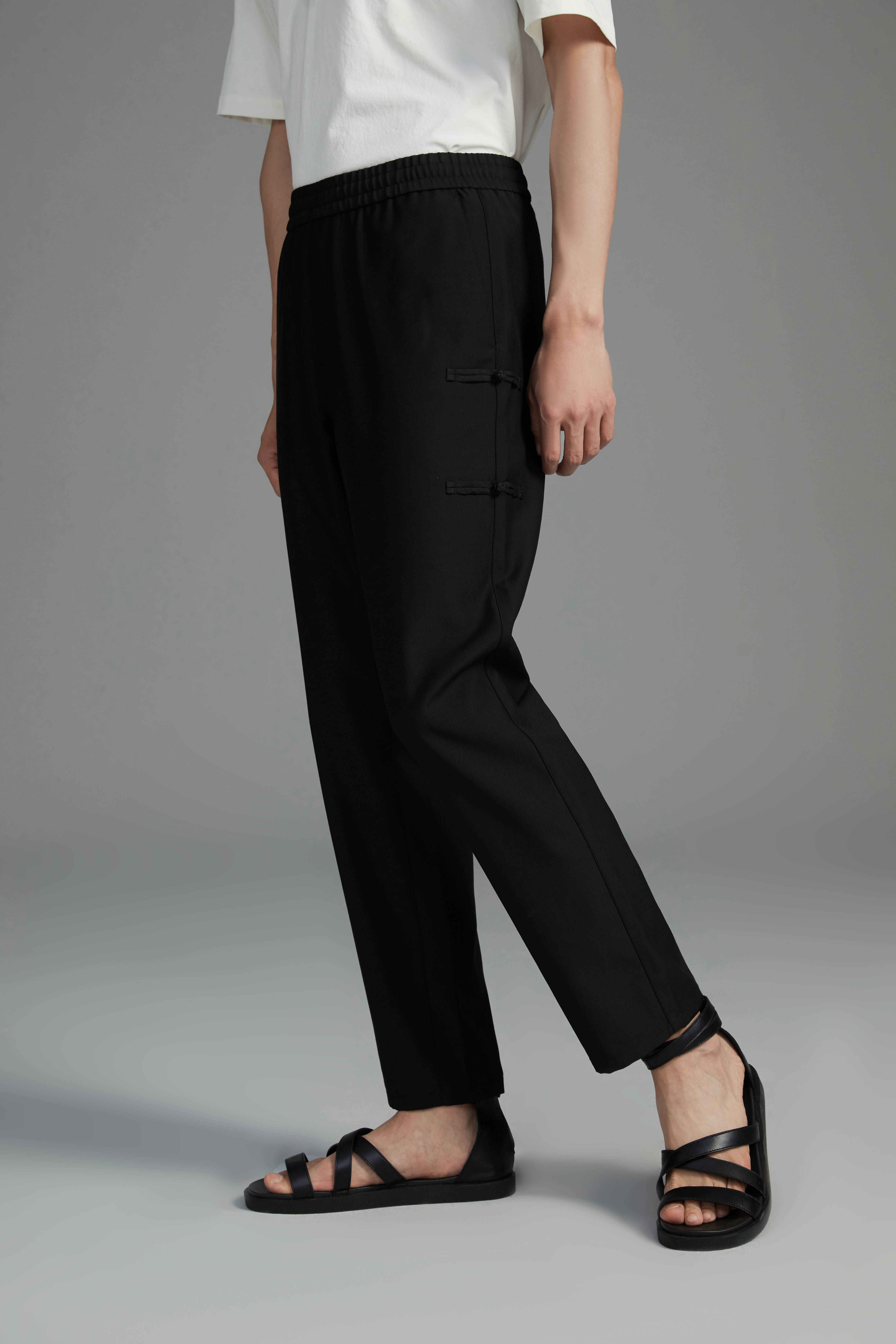 盘扣虽小,却包含了中华民族独特的文化内涵。设计师采用简单的基础款抽绳休闲裤,结合中国元素的代表性装饰配件——盘扣,兼具功能性及传统装饰?法的代表,表现出中国服饰的精髓。