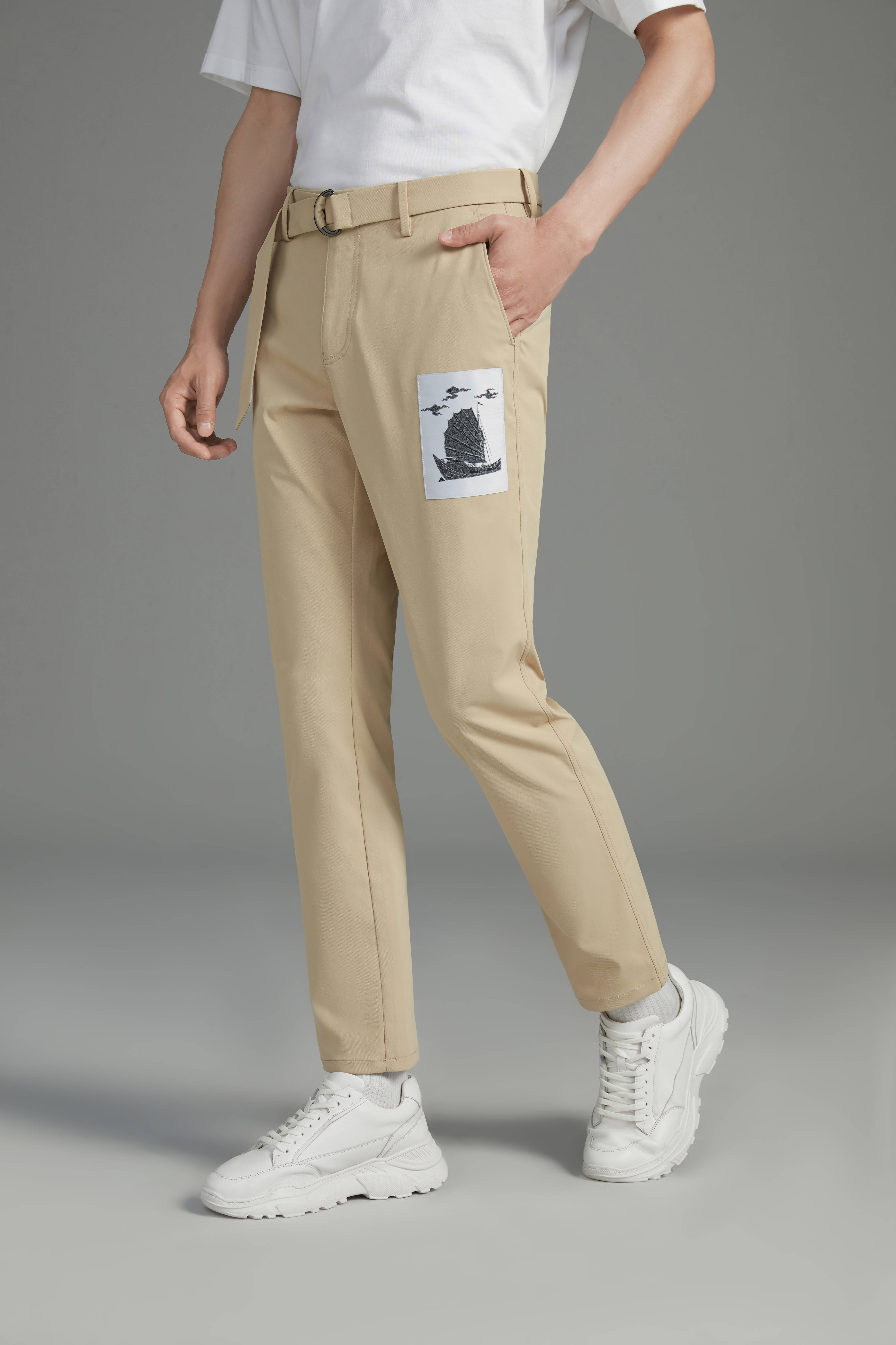 2022巴黎时装周秀款胶囊系列以帆船元素作为开场,采用男裤版型中简洁的基础款来呈现,结合当下?常流?的?体式?腰带设计,提升了时装的层次感;融入中国帆船的贴标元素来呼应丝路上的中国元素,用精致细腻的帆船织唛标,从细节上提升了整个款式的亮点。