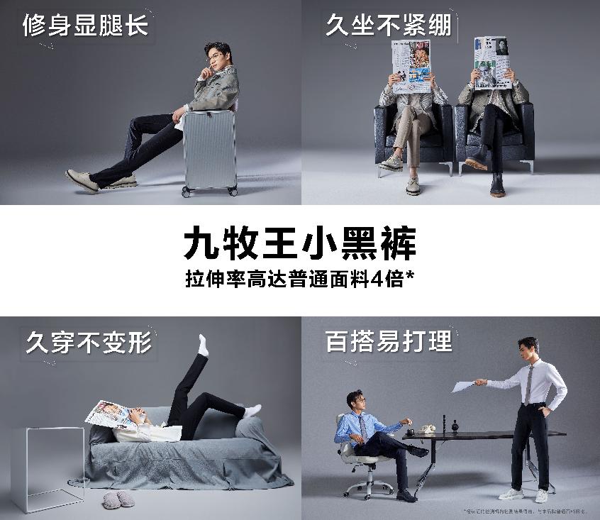 小黑裤的诞生,脱胎于九牧王对消费需求的精准洞察与匠心工艺的雕琢。为了满足现代男性对商务礼仪与舒适穿着兼顾的着装需求,九牧王将织造工艺与面料特性创新结合,研发出拉伸率高达普通面料4倍④的高弹面料,结合多年积累下的1200万人体数据⑤,成功打造出穿着舒适有型、柔软有度的“小黑裤”。小黑裤具有形态优异、裤型稳定、包裹性好、记忆回弹等产品优势,带来久穿不紧绷、修身显腿长、百搭好打理等穿着体验,轻松转换于商务与休闲之间,适合办公、出差、运动等各类日常生活场景,当属高性能男裤典范,面市以来备受广大男性用户的喜爱,一跃成为九牧王爆款单品。