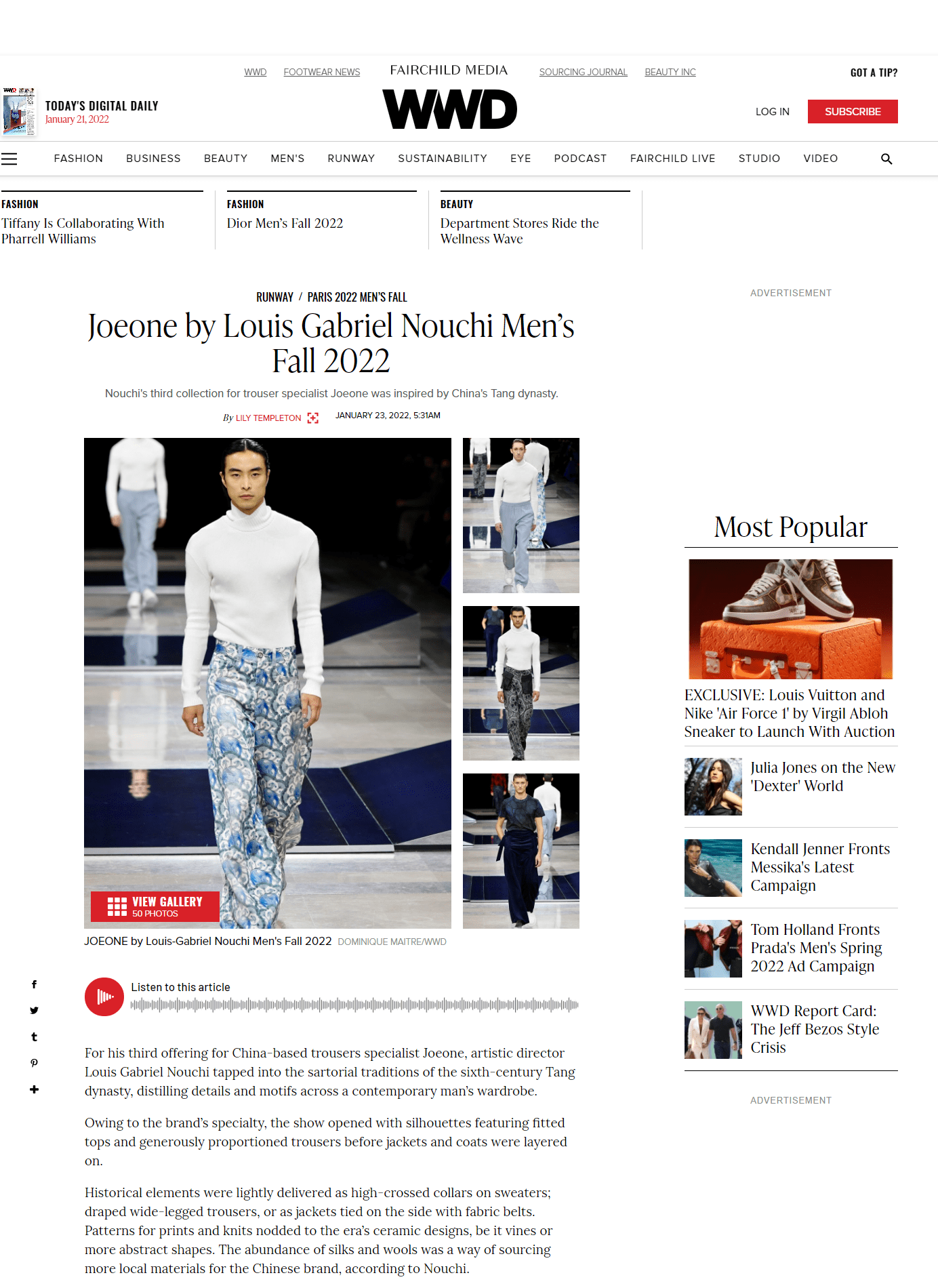 此次九牧王再登巴黎时装周,获得了时尚行业媒体的高度关注与赞誉。WWD、THE IMPRESSION、MADAME.LEFIGARO、FASHIONMAGAZINE、ELLEMEN等国际时尚媒体都第一时间报道了此次裤秀。同时,裤秀在国内的微博平台直播观看量达3147万,#九牧王巴黎唐风裤秀#话题阅读次数近1.5亿,#一场跨越千年的对话#话题阅读次数近1.7亿。(数据截至北京时间2022年01月24日9:00)
