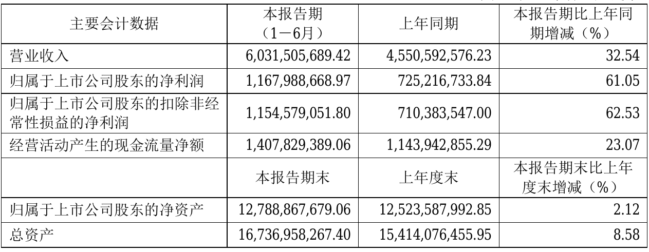 8月18日,北元集团(601568)近日发布2021年半年度报告,报告期内营业收入6,031,505,689.42元,同比增加32.54%;净利1,167,988,668.97元,同比净利增加61.05%。