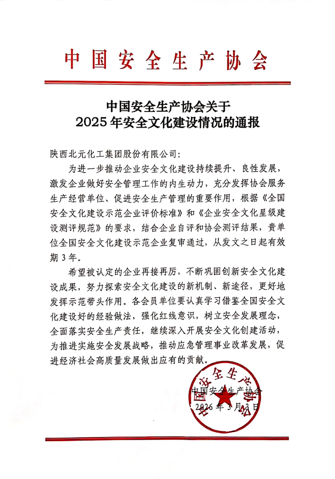 近日,全国安全文化建设示范企业复审结果正式揭晓,北元集团凭借扎实的安全文化建设成效、完善的安全管理体系,顺利通过复审,这是对公司安全文化建设工作的高度认可,彰显了公司在安全生产方面取得的显著成效和责任担当。