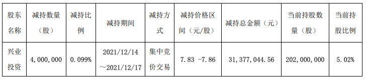 兴业投资于2021年10月19日通过大宗交易方式减持1400万股股份,减持数量占本行总股本0.348%,减持价格为8元/股,减持总金额为11,200万元。2021年12月14日至12月17日,通过集中竞价减持400万股股份,占本行总股本0.1%,减持价格区间为7.83元/股—7.86元/股,减持总金额3137.70万元;上述合计减持1800万股股份,减持后兴业投资持股比例降至5.02%。截至公告披露日,本次减持计划减持数量已过半,减持计划尚未实施完毕。
