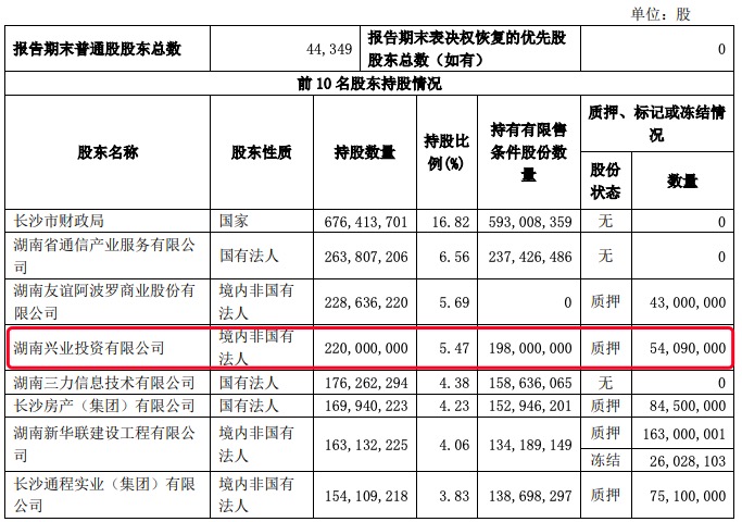 长沙银行三季报显示,截至三季度末,兴业投资持有长沙银行220,000,000股股份,持股比例为5.47%,为长沙银行第四大股东,其中54,090,000股处于质押状态。