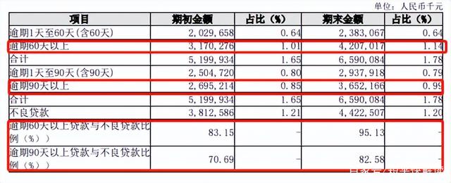 其中逾期60天以上贷款余额42.07亿元,较上年末增加10.37亿元,增长率32.7%,逾期60天以上贷款与不良贷款比例为95.13%,较上年末上升11.98个百分点;逾期90天以上贷款余额为36.52亿元,较上年末增加9.57亿元,增长率35.51%,逾期90天以上贷款与不良贷款比例为82.58%,较上年末增加11.89个百分点。