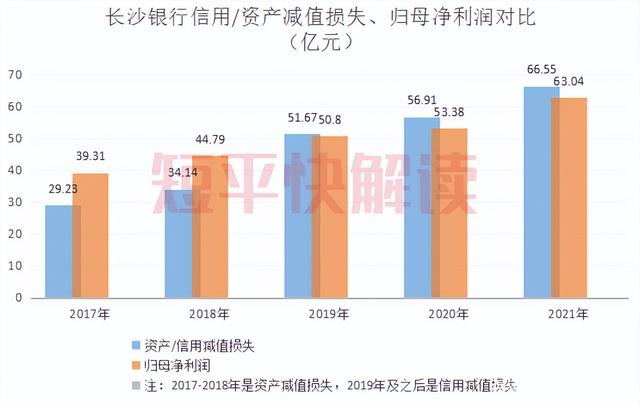 如前文提及,长沙银行的资产保持稳定增长,逼近8000亿大关,不过,与此同时,长沙银行的资产/信用减值损失也是逐年攀高,2017年-2018年,长沙银行的资产减值损失分别为23.23亿元、34.14亿元,2019年-2021年,长沙银行的信用减值损失分别为51.67亿元、56.91亿元、66.55亿元,快速增长的减值损失严重侵蚀长沙银行的利润。