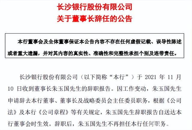 11月10日,因工作变动原因,朱玉国申请辞去长沙银行董事、董事长及战略委员会主任委员职务,辞职后,不在长沙银行担任任何职务。