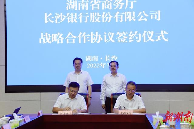 为全面落实“三高四新”战略定位和使命任务,助力湖南商务和开放型经济高质量发展,共同构建商务和开放型经济与金融合作平台,今日,湖南省商务厅与长沙银行举行战略合作协议签约仪式,省商务厅党组书记、厅长沈裕谋,长沙银行党委书记、董事长赵小中出席活动并讲话。省商务厅党组成员、副厅长李心球,长沙银行党委委员、副行长李兴双出席会议并代表双方签约。