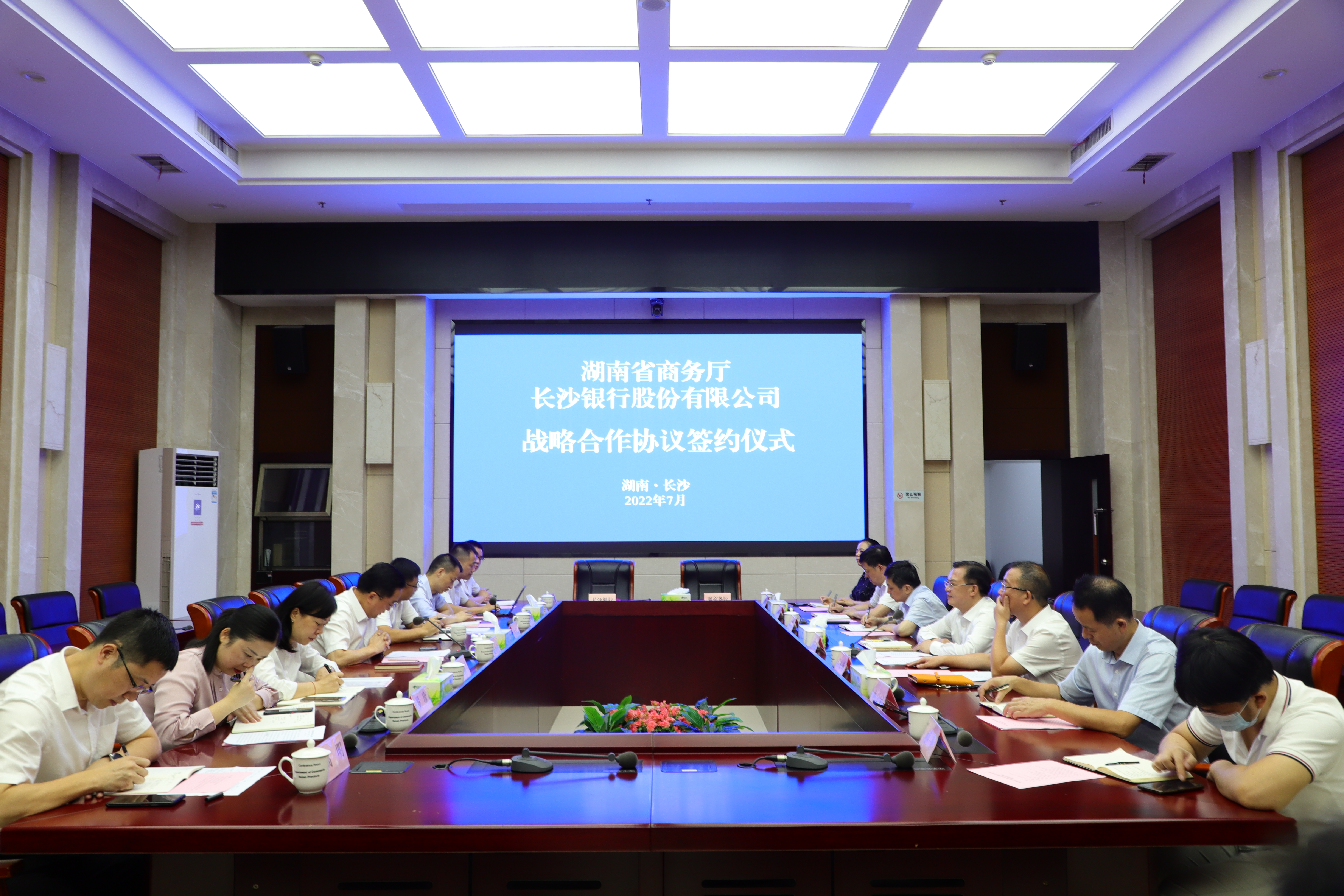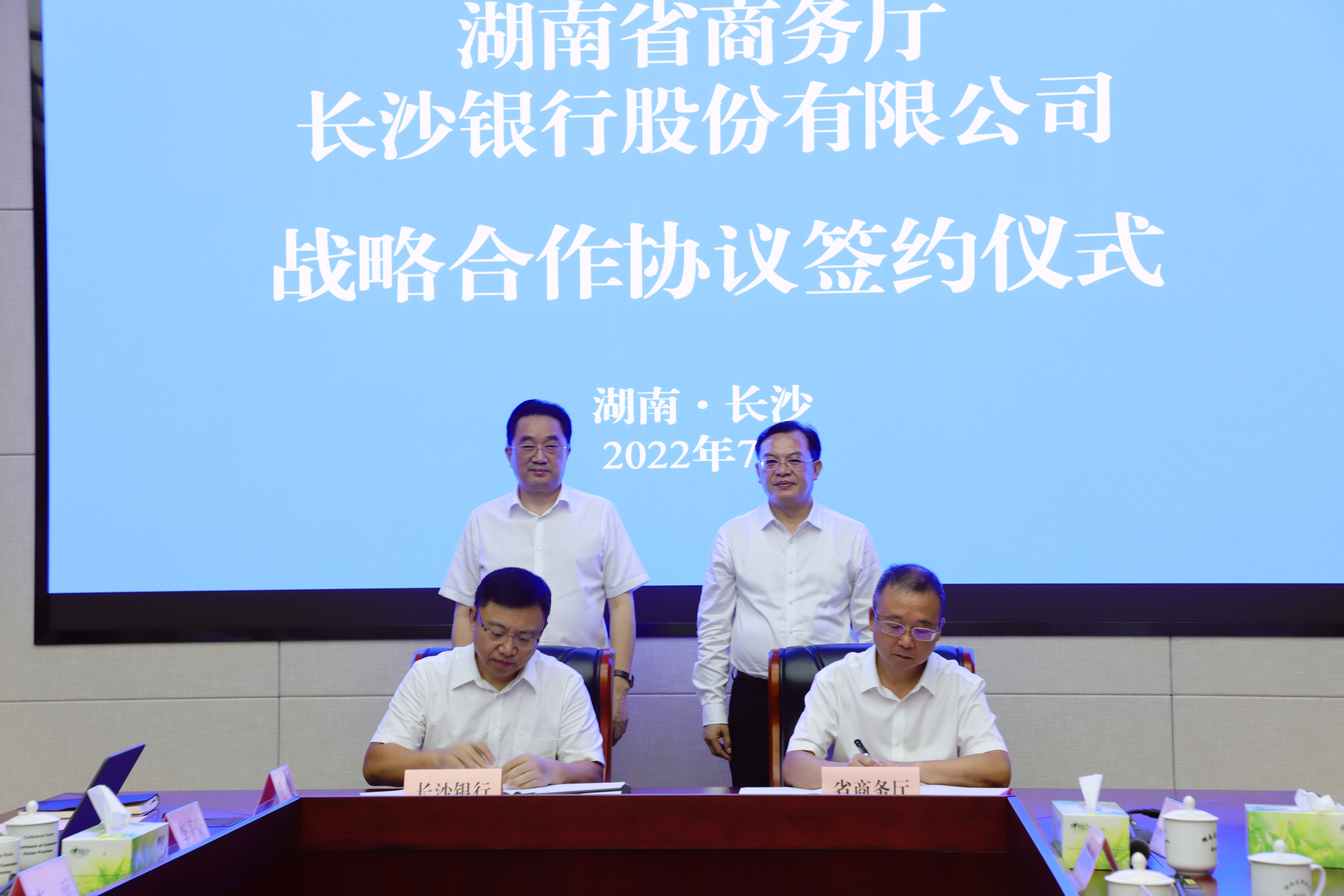 7月7日上午,省商务厅与长沙银行正式签订《湖南省商务厅长沙银行股份有限公司战略合作协议》,厅党组书记、厅长沈裕谋和长沙银行党委书记、董事长赵小中见证签约,李心球副厅长出席签约仪式并现场签约。