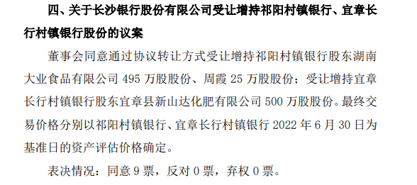 该议案显示,董事会同意通过协议转让方式受让增持祁阳村镇银行股东湖南大业食品有限公司495万股股份、周霞25万股股份;受让增持宜章长行村镇银行股东宜章县新山达化肥有限公司500万股股份。最终交易价格分别以祁阳村镇银行、宜章长行村镇银行2022年6月30日为基准日的资产评估价格确定。该议案获得全票通过。