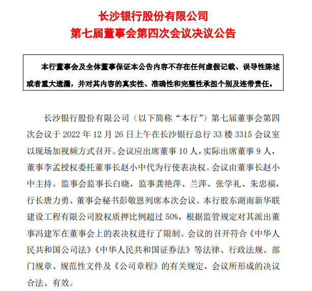 12月26日,长沙银行发布第七届董事会第四次会议决议公告。公告显示,该行对九项议案下议案进行了审议并表决。其中,第四项议案为《关于长沙银行股份有限公司受让增持祁阳村镇银行、宜章长行村镇银行股份的议案》。