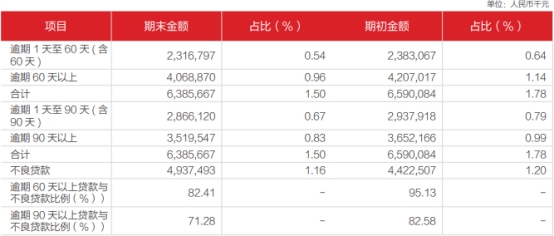 截至报告期末,长沙银行逾期贷款63.86亿元,逾期贷款在贷款总额中占比1.50%,较上年末下降0.28个百分点。其中逾期60天以上贷款余额40.69亿元,逾期60天以上贷款在贷款总额中占比0.96%,逾期60天以上贷款与不良贷款比例为82.41%。逾期90天以上贷款余额35.20亿元,较上年末下降1.33亿元,逾期90天以上贷款在贷款总额中占比0.83%,较上年末下降0.16个百分点,逾期90天以上贷款与不良贷款比例为71.28%,较上年末下降11.30个百分点。逾期60天以上贷款偏离度与逾期90天以上贷款偏离度均低于1。