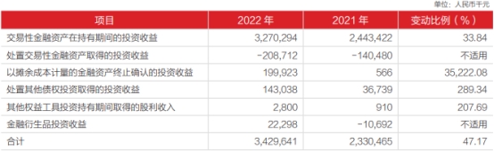 2022年,长沙银行实现投资收益34.30亿元,同比增长47.17%,主要是因为非货币基金投资分红增加。