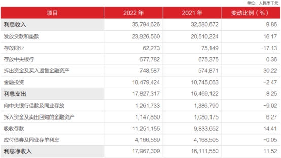 2022年,长沙银行实现利息净收入179.67亿元,同比增长11.52%,占营业收入的78.57%;其中利息收入357.95亿元,同比增长9.86%,利息支出178.27亿元,同比增长8.25%。