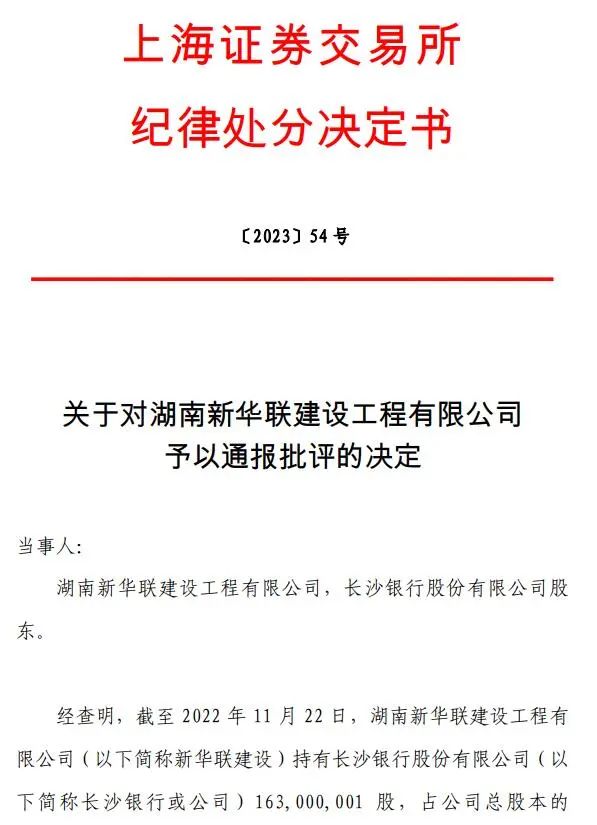 5月24日,上交所发布公告,对长沙银行(601577)股东湖南新华联建设工程有限公司下发纪律处分决定书予以通报批评。