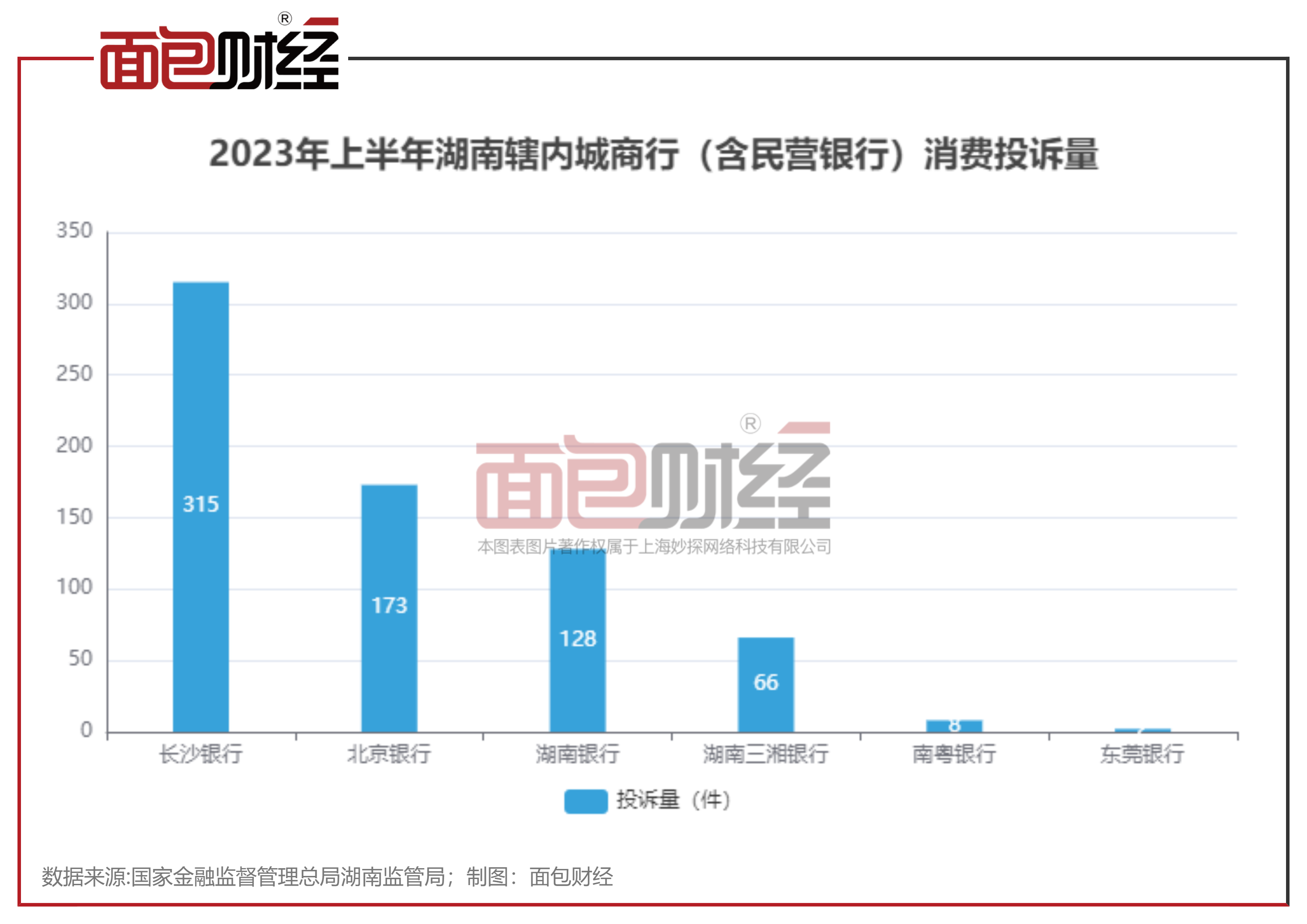 《通报》数据显示,2023上半年,长沙银行湖南分行的投诉量为315件,排名第一。