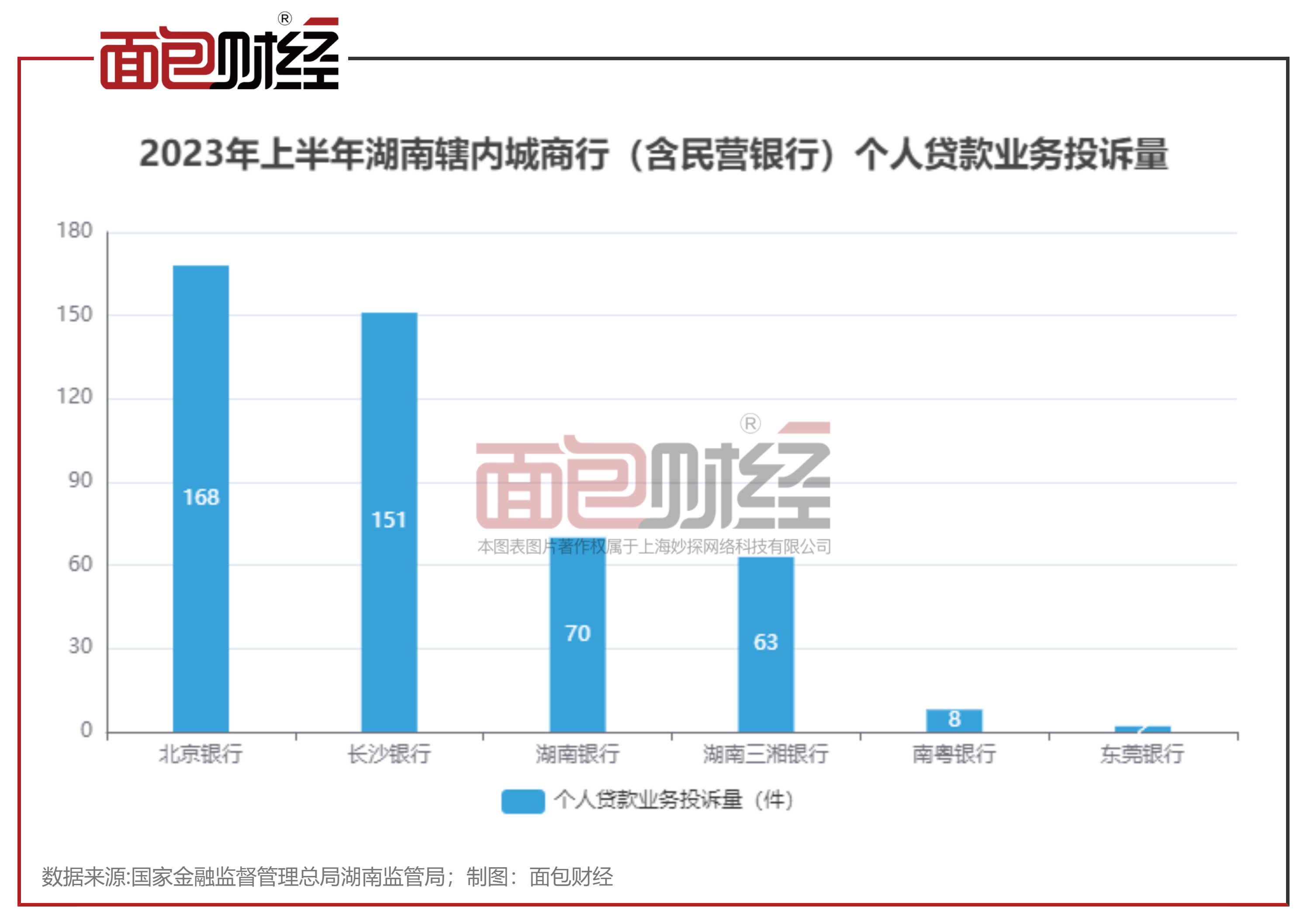数据显示,湖南辖内城市商业银行(含民营银行)个人贷款业务的中位数为66.5件,长沙银行湖南分行的投诉量是中位数的2.27倍。