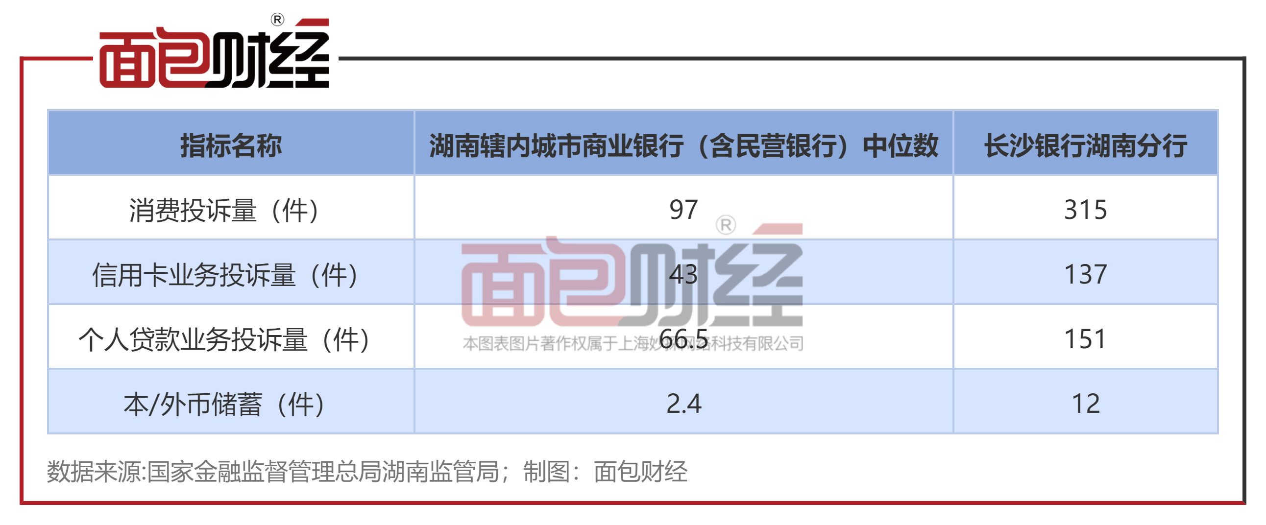 数据显示,湖南辖内城市商业银行(含民营银行)信用卡业务的中位数为43件,长沙银行湖南分行的投诉量是中位数的3.19倍。