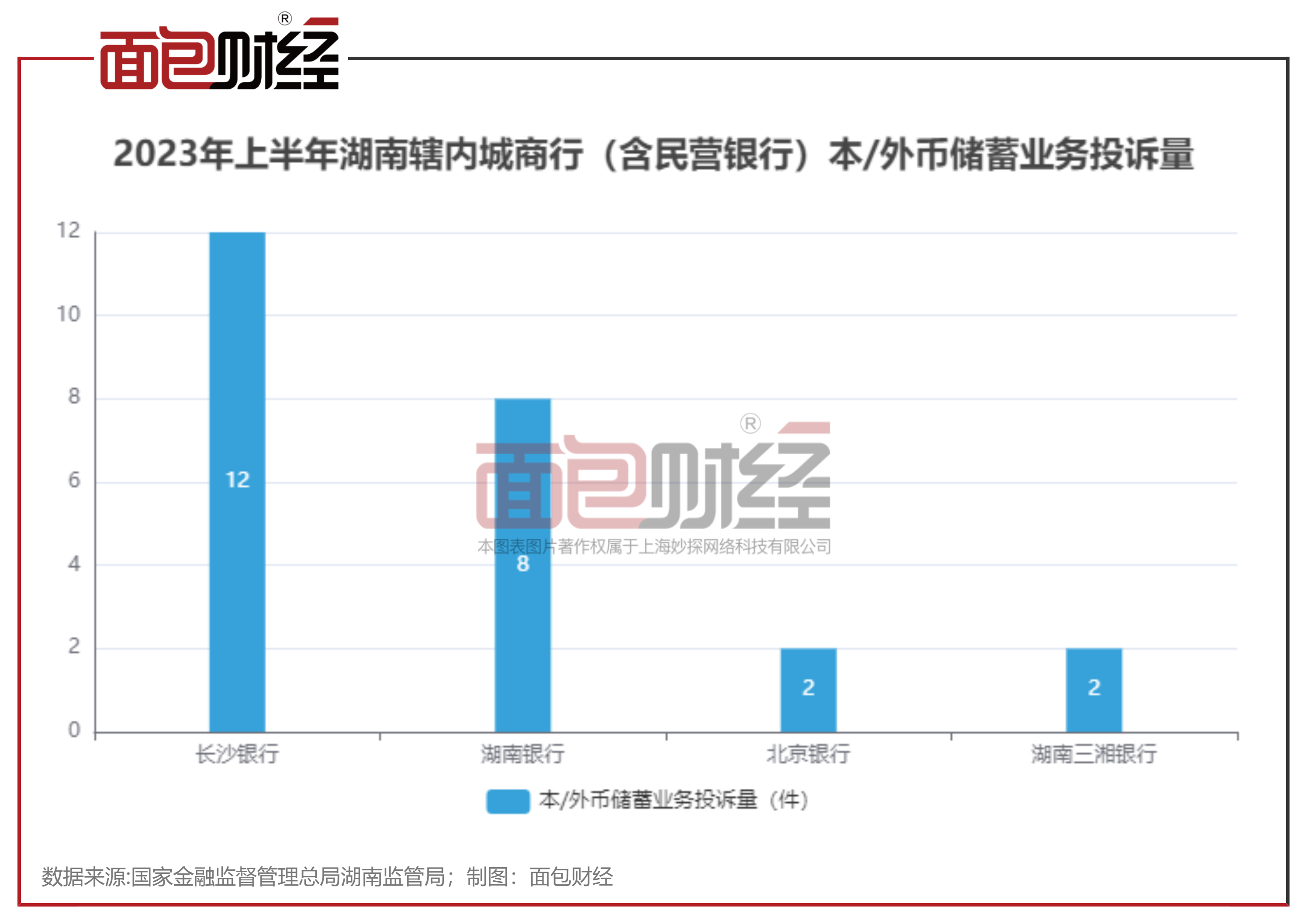 本/外币储蓄业务方面,2023上半年,长沙银行湖南分行的投诉量为12件,在城商行中排名第一。