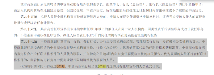 根据原银监会颁布的《中资商业银行行政许可事项实施办法》第97条规定:“中资商业银行董事长、行长……的任职资格未获核准前,中资商业银行应当指定符合相应任职资格条件的人员代为履职……代为履职的时间不得超过6个月。中资商业银行应当在6个月内选聘具有任职资格的人员正式任职。”