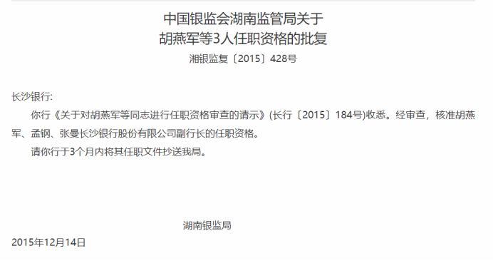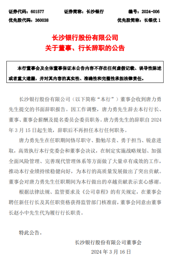 今年3月16日,长沙银行发布公告称,该行行长唐力勇辞职,并宣布在该行董事会聘任新任行长及其任职资格获得监管部门核准前,由该行董事长赵小中代为履行行长职责。
