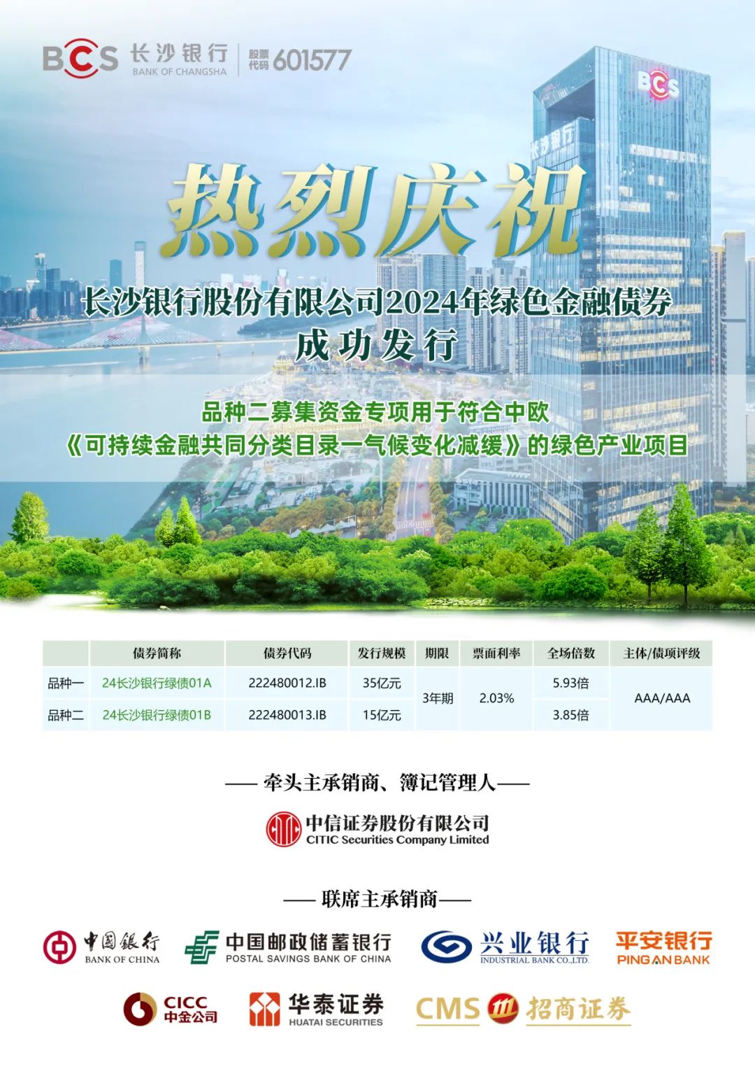 本期债券牵头主承销商和簿记管理人为中信证券,联席主承销商为中金公司、华泰证券、招商证券、中国银行、邮储银行、兴业银行和平安银行。本期发行获得市场机构的踊跃认购,参与机构覆盖银行、保险、基金、券商等多层次投资主体,充分体现了投资者对长沙银行信用资质和发展前景的高度认可。线上簿记发行全流程清晰规范、全程留痕,有效提升了发行效率和透明度。