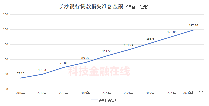 2020年,长沙银行贷款损失准备突破100亿,达到111.59亿元,2024年前三季度这一数据为197.86亿元。