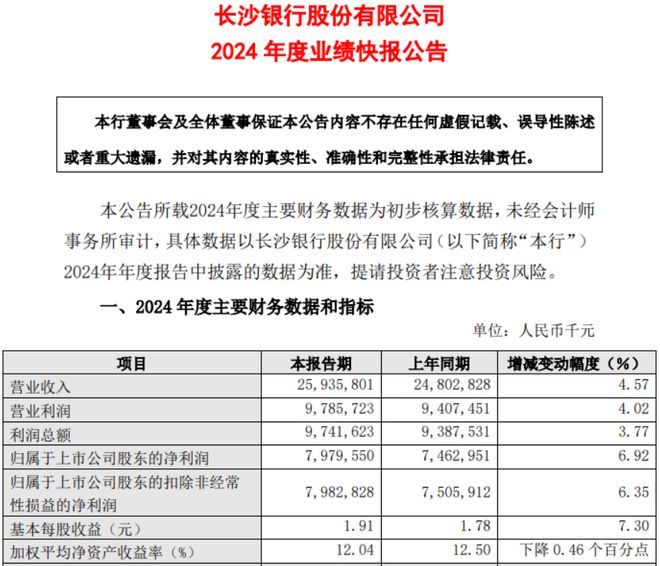 近日,长沙银行抢先发布了A股首份城商行2024年业绩快报。2024年,长沙银行实现营收259.4亿元,同比增长4.6%;归母净利润79.8亿元,同比增长6.9%。