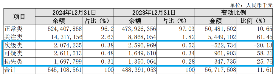 2024年末,长沙银行的不良贷款余额为63.84亿元,较2023年末的55.97亿元增加7.87亿元,同比增长14%。其中次级类贷款为20.74亿元,同比下降20.13%;可疑类贷款为26.12亿元,同比增长58.31%;损失类贷款为16.98亿元,同比增长25.76%。