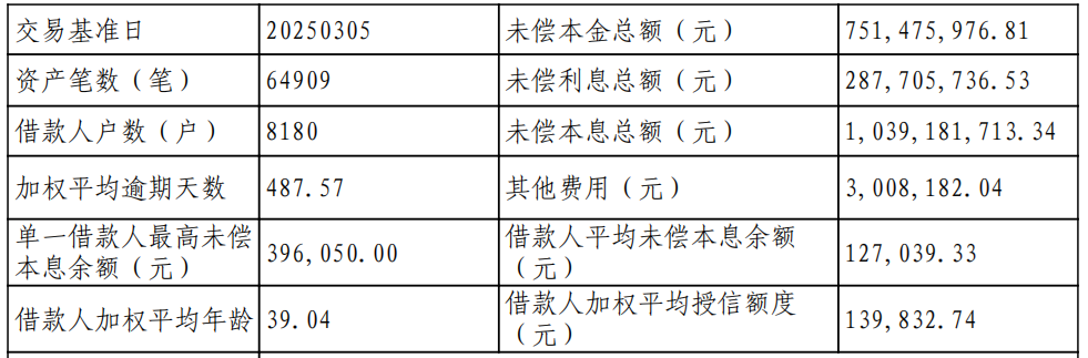 长银五八消金此次拟挂牌转让的10.39亿元个人消费不良贷款,交易基准日是2025年3月5日,未偿本金约为7.51亿元,未尝利息约为2.88亿元,借款人为8180户,加权平均逾期天数为487.57天,资产笔数为64909笔,全部为信用担保。