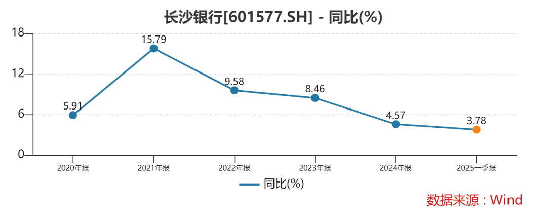 到了2025年一季度,长沙银行的营收与归母净利润增速分别降至3.78%、3.81%。