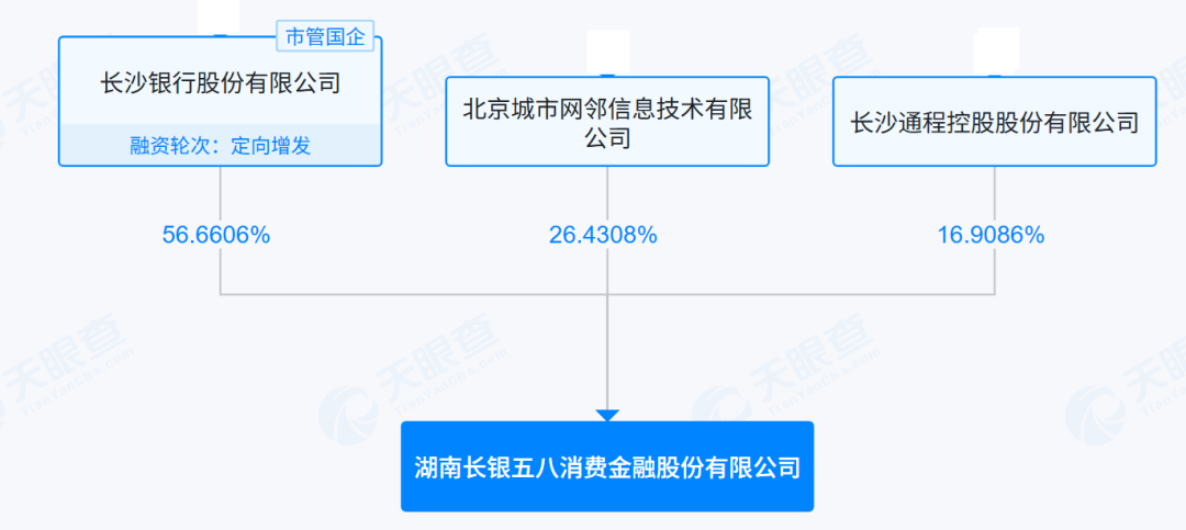 作为湖南省首家持牌消金机构,长银五八消金由长沙银行持股51%,北京城市网邻信息技术有限公司和长沙通程控股股份有限公司分别持股33%和16%。此后经过几轮扩充注册资本,截至2024年12月31日,长银五八消金的股权结构变更为长沙银行持股56.66%,上述另外两家公司分别持股26.43%、16.91%。