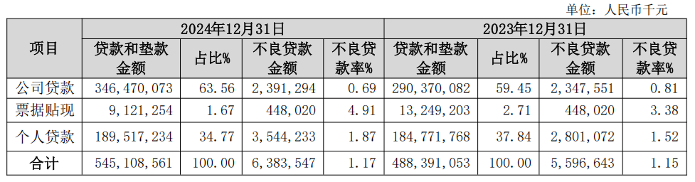 截至2024年12月31日,长沙银行的贷款总额为5451.09 亿元,同比增加11.61%。其中,公司贷款为3464.70亿元,占比63.56%,较2023年末增加4.11个百分点;个人贷款为1895.17亿元,占比34.77%,下降3.07个百分点。