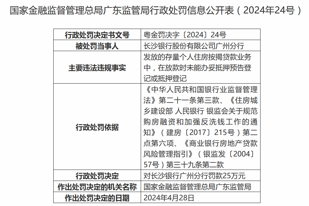 2024年5月6日,国家金融监督管理总局广东监管局公布行政处罚信息公开表(粤金罚决字〔2024〕24号),长沙银行广州分行因发放的存量个人住房按揭贷款业务中,在放款时未能办妥抵押预告登记或抵押登记被罚款25万元。长沙银行也曾在存款业务方面“吃下”罚单。2023年5月长沙银行张家界分行因通过第三方违规办理部分储蓄存款业务,被监管部门罚款80万元。