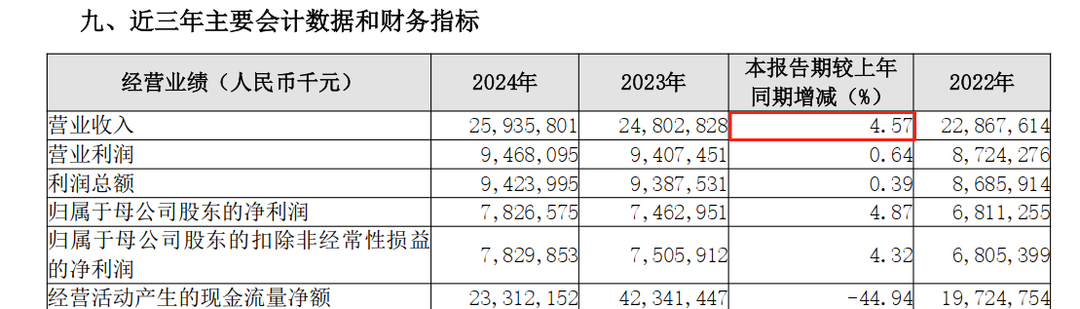 2024年,长沙银行实现营业收入259.36亿元,同比增加11.33亿元,增长4.57%;归母净利润78.27亿元,同比增加3.64亿元,增长4.87%。