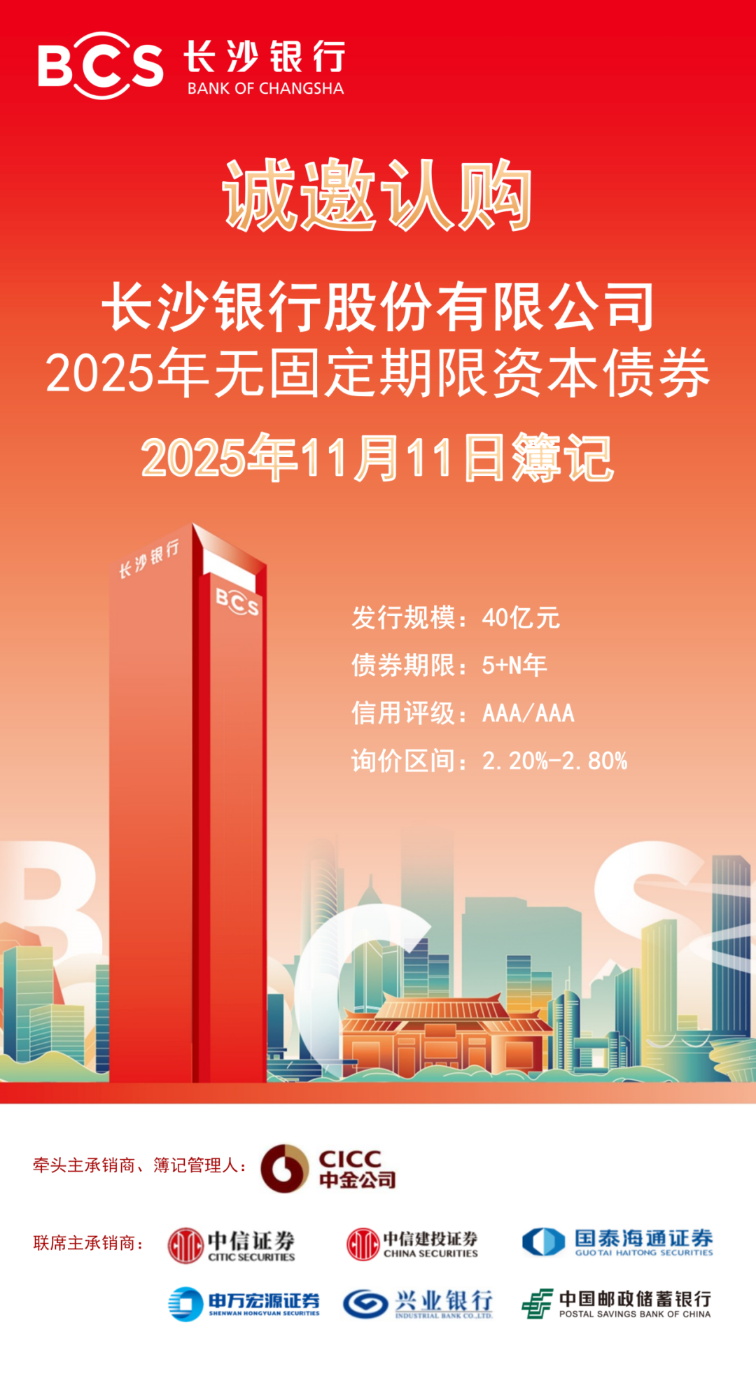 2025年11月11日,长沙银行股份有限公司(以下简称“长沙银行”)将在全国银行间债券市场发行长沙银行股份有限公司2025年无固定期限资本债券。本期债券发行规模为40亿元,期限为5+N年,主体和债项评级均为AAA,本期债券募集资金将依据适用法律和主管部门的批准用于补充长沙银行其他一级资本。诚邀投资人认购询价。
