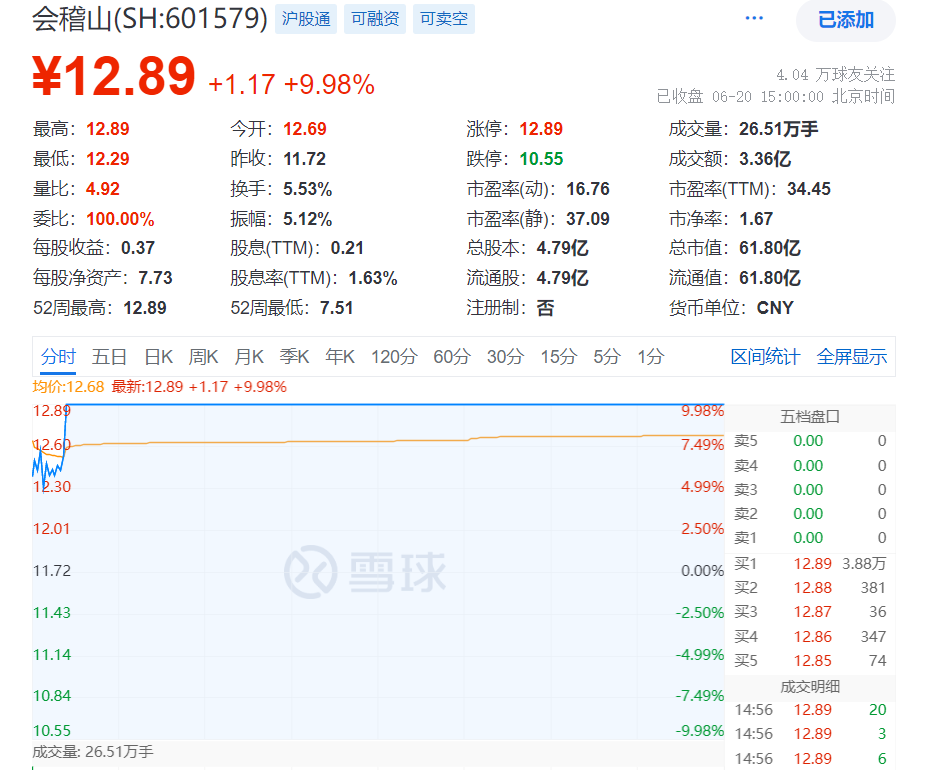 6月20日,会稽山股价涨停,截至收盘报12.89元/股,涨9.98%,总市值61.8亿元。该股已连续两日涨停。