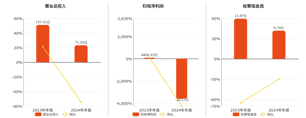 公司营业总收入为71.52亿元,较去年同报告期营业总收入减少85.99亿元,同比较去年同期下降54.59%。归母净利润为-28.27亿元,较去年同报告期归母净利润减少28.96亿元,同比较去年同期下降4254.11%。经营活动现金净流入为9.74亿元,较去年同报告期经营活动现金净流入减少4.14亿元,同比较去年同期下降29.82%。