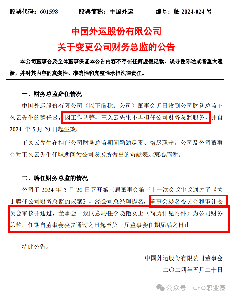 2024年5月21日,上交所主板上市公司中国外运(601598.SH)公告称,中国外运股份有限公司董事会近日收到公司财务总监王久云先生的辞任函,因工作调整,王久云先生不再担任公司财务总监职务,并自2024年5月20日起生效。