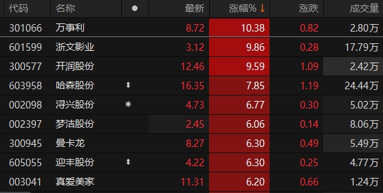 2月19日早盘,申万一级行业板块中,纺织服饰板块表现活跃。截至9时52分,万事利涨超10%,凯润股份涨逾9%,哈森股份涨超7%,浔兴股份、梦洁股份、曼卡龙等跟涨。此前,浙文影业涨停。