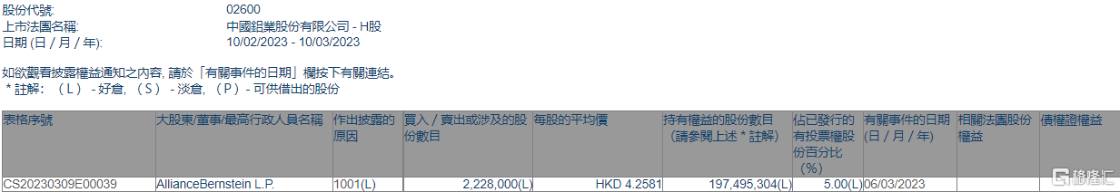 根据联交所最新权益披露资料显示,2023年3月6日,中国铝业(02600.HK)获AllianceBernstein L.P.在场内以每股均价4.2581港元增持222.8万股,涉资约948.7万港元。