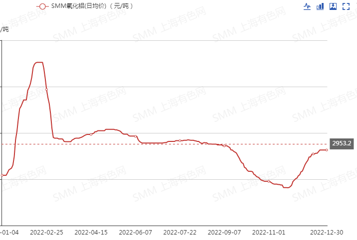国内市场方面,国内氧化铝价格受国际事件的影响较小,氧化铝价格在自身基本面的影响下,上涨幅度弱于国外,氧化铝市场价格呈“N”字型走势波动。据SMM报价显示,一季度,在冬奥限产等影响下,国内氧化铝现货价格出现一轮比较明显的上涨行情,价格最高至 3,305 元/吨,二季度价格在 2,957-3,016元/吨之间横盘波动,三季度价格开始缓步下行,至 11 月下旬降至年内最低价 2,764元/吨,年末由于北方地区规模化的减产以及重污染天气对生产的限制,氧化铝价格小幅回升。