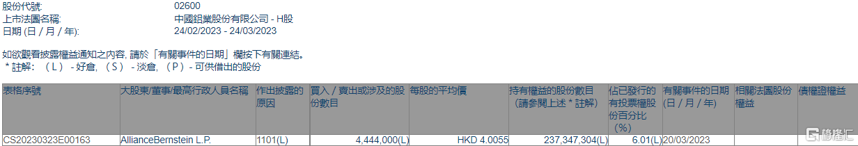 根据联交所最新权益披露资料显示,2023年3月20日,中国铝业(02600.HK)获AllianceBernstein L.P.在场内以每股均价4.0055港元增持444.4万股,涉资约1780.04万港元。