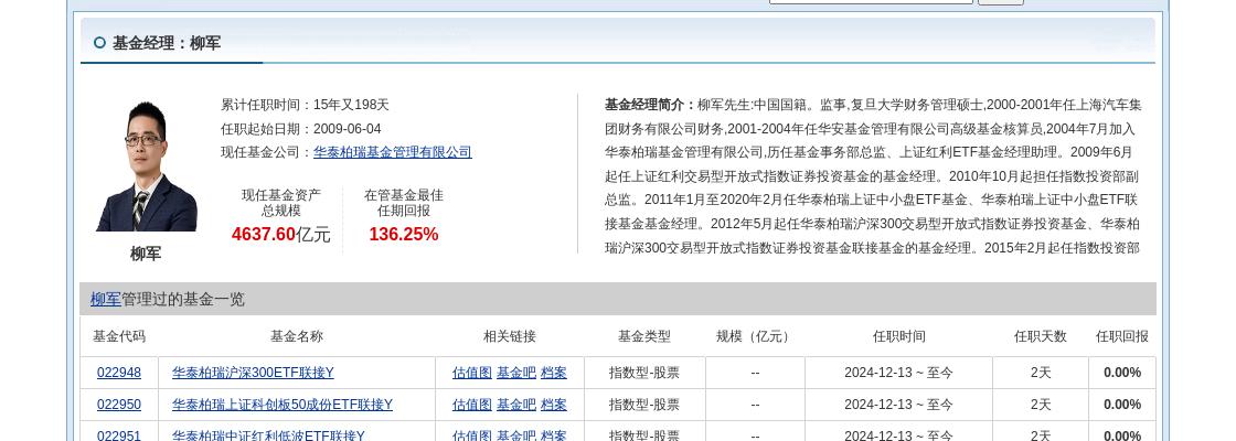 简历显示,柳军先生:中国国籍。监事,复旦大学财务管理硕士,2000-2001年任上海汽车集团财务有限公司财务,2001-2004年任华安基金管理有限公司高级基金核算员,2004年7月加入华泰柏瑞基金管理有限公司,历任基金事务部总监、上证红利ETF基金经理助理。2009年6月起任上证红利交易型开放式指数证券投资基金的基金经理。2010年10月起担任指数投资部副总监。2011年1月至2020年2月任华泰柏瑞上证中小盘ETF基金、华泰柏瑞上证中小盘ETF联接基金基金经理。2012年5月起任华泰柏瑞沪深300交易型开放式指数证券投资基金、华泰柏瑞沪深300交易型开放式指数证券投资基金联接基金的基金经理。2015年2月起任指数投资部总监。2015年5月起任华泰柏瑞中证500交易型开放式指数证券投资基金及华泰柏瑞中证500交易型开放式指数证券投资基金联接基金的基金经理。2018年3月至2018年11月任华泰柏瑞锦利灵活配置混合型证券投资基金和华泰柏瑞裕利灵活配置混合型证券投资基金的基金经理。2018年3月至2018年10月任华泰柏瑞泰利灵活配置混合型证券投资基金的基金经理。2018年4月起任华泰柏瑞MSCI中国A股国际通交易型开放式指数证券投资基金的基金经理。2018年10月起任华泰柏瑞MSCI中国A股国际通交易型开放式指数证券投资基金联接基金的基金经理。2018年12月起任华泰柏瑞中证红利低波动交易型开放式指数证券投资基金的基金经理。2019年7月起任华泰柏瑞中证红利低波动交易型开放式指数证券投资基金联接基金的基金经理。2019年9月至2021年4月任华泰柏瑞中证科技100交易型开放式指数证券投资基金的基金经理。2020年2月至2021年4月任华泰柏瑞中证科技100交易型开放式指数证券投资基金联接基金的基金经理。2020年9月起任华泰柏瑞上证科创板50成份交易型开放式指数证券投资基金的基金经理。2021年3月起任华泰柏瑞上证科创板50成份交易型开放式指数证券投资基金联接基金的基金经理。2021年5月起任华泰柏瑞南方东英恒生科技指数交易型开放式指数证券投资基金(QDII)的基金经理。2021年7月至2023年8月任华泰柏瑞中证沪港深创新药产业交易型开放式指数证券投资基金的基金经理。2021年8月至2023年12月06日任华泰柏瑞中证全指医疗保健设备与服务交易型开放式指数证券投资基金的基金经理。2021年12月起任华泰柏瑞中证500增强策略交易型开放式指数证券投资基金的基金经理。2022年8月起任华泰柏瑞南方东英恒生科技指数交易型开放式指数证券投资基金联接基金(QDII)的基金经理。2022年11月起任华泰柏瑞中证韩交所中韩半导体交易型开放式指数证券投资基金、华泰柏瑞中证1000增强策略交易型开放式指数证券投资基金的基金经理。2023年3月起任华泰柏瑞纳斯达克100交易型开放式指数证券投资基金(QDII)的基金经理。2023年9月起任华泰柏瑞中证2000交易型开放式指数证券投资基金的基金经理。现任华泰柏瑞基金管理有限公司副总经理。2023年10月起任华泰柏瑞中证A股交易型开放式指数证券投资基金的基金经理。