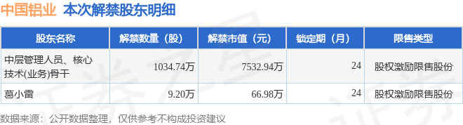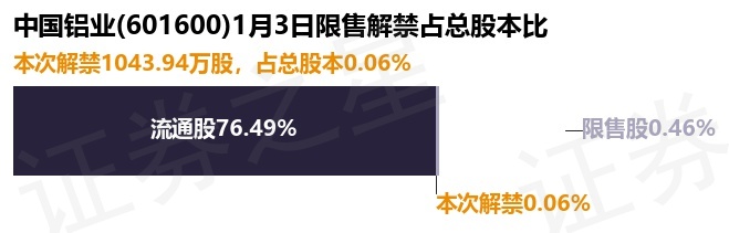 根据市场公开信息整理,中国铝业(601600)于1月3日将有1043.94万股限售股份解禁,为公司股权激励限售股份,占公司总股本0.06%。(本次数据根据历史公告整理得出,实际情况以上市公司最新公告为准)最近一年内,该股累计解禁4439.28万股,占总股本的0.26%。本次解禁后,公司还有7899.38万股限售股份,占总股本0.46%。具体如下图所示:
