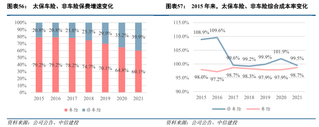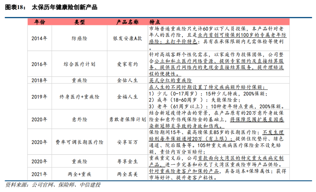 我国商业健康险业务模式、盈利能力仍有较大的发展空间:1)拆解近年来赔付率提升的原因,主要系竞争加剧后的费率下降,实际保障成本未有明显提升;而中国台湾地区的商业健康险赔付率提升,主要系健康险产品每单位保额的赔付提升、对应的费率也同步提升,进入商业模式的良性循环期。2)美国商业健康险通过整合线下服务网络,构建了较为成熟的商业模式。2020年美国商业健康险件均保费是我国的6-7倍,而赔付率是我国商业健康险的2.3-2.6倍,我国商业健康险的件均保费、盈利能力仍有提升空间。近年来,太保加大产品创新力度+领先同业加大康养服务整合。以剩余边际/准备金代表存量业务的未来利润率,自2016年以来,公司利润率自28%提升至39.7%,盈利能力持续提升。
