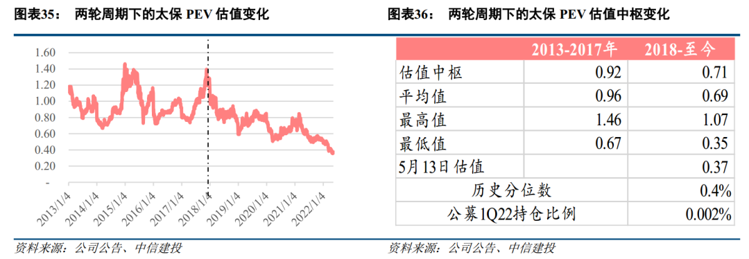 分区域看,大众市场的医疗健康消费支出增速更快、且重疾险饱和度较低,发展潜力更大,太保主力市场主要位于大众市场,近年来太保在该区域的健康险市场份额整体呈提升态势。本轮周期中,太保对职业化代理人方向最为坚定,代理人13个月留存率自1Q22开始企稳回升、月人均保费增速同比+19.9%。第三支柱养老金市场开闸、保险投资端逐步放开,严监管周期接近尾声,已无继续向下空间。对比两类周期下太保的表现,在宽松周期下,太保PEV估值中枢比紧周期下提升约30.4%。