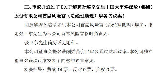 10月30日金融一线消息,中国太保近日发布公告称,该公司董事会会议审议并通过了《关于解聘孙培坚先生中国太平洋保险(集团)股份有限公司首席风险官(总经理助理)职务的议案》,同意解聘孙培坚首席风险官(总经理助理)职务,指定张卫东为该公司首席风险官临时负责人。